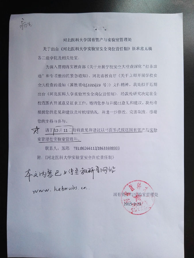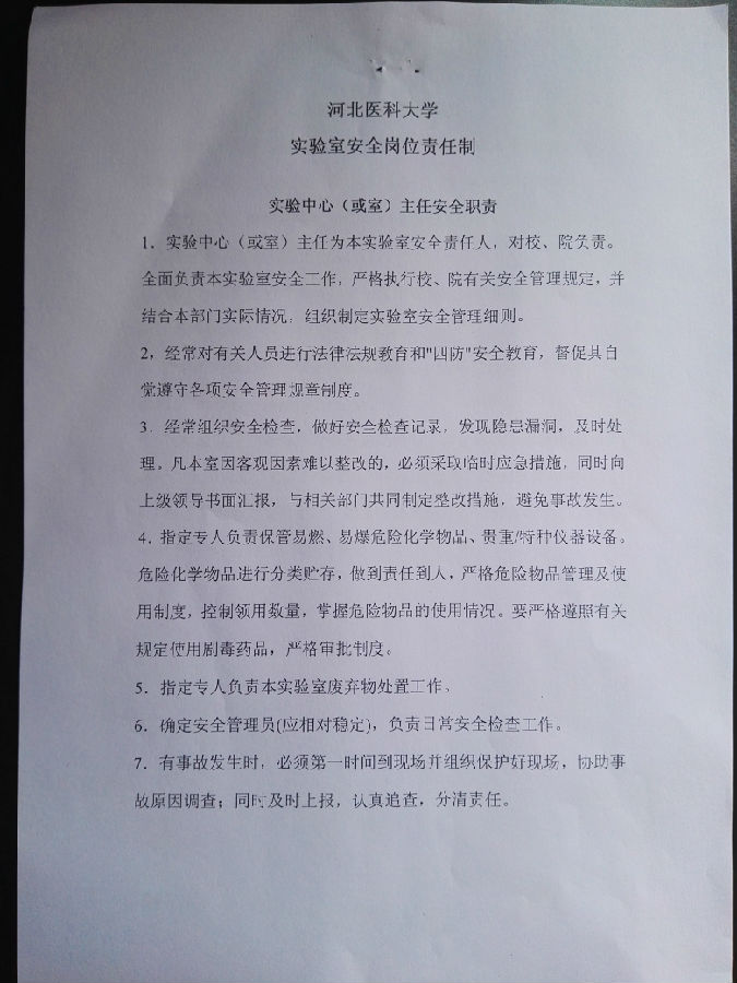《河北医科大学实验室安全岗位责任制》征求意见稿